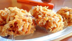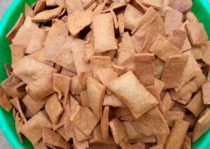 Chin chin is a crunchy snack made with well prepared dough, flavored and deep-fried; chin chin could also be oven-baked. The size and shape of the snack is generally of individual preference.