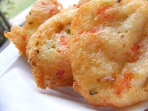 It is made from a specially prepared dough consisting of corn meal, sugar and water (boiling hot water), rolled to shape and deep-fried. It could be spiced or not.